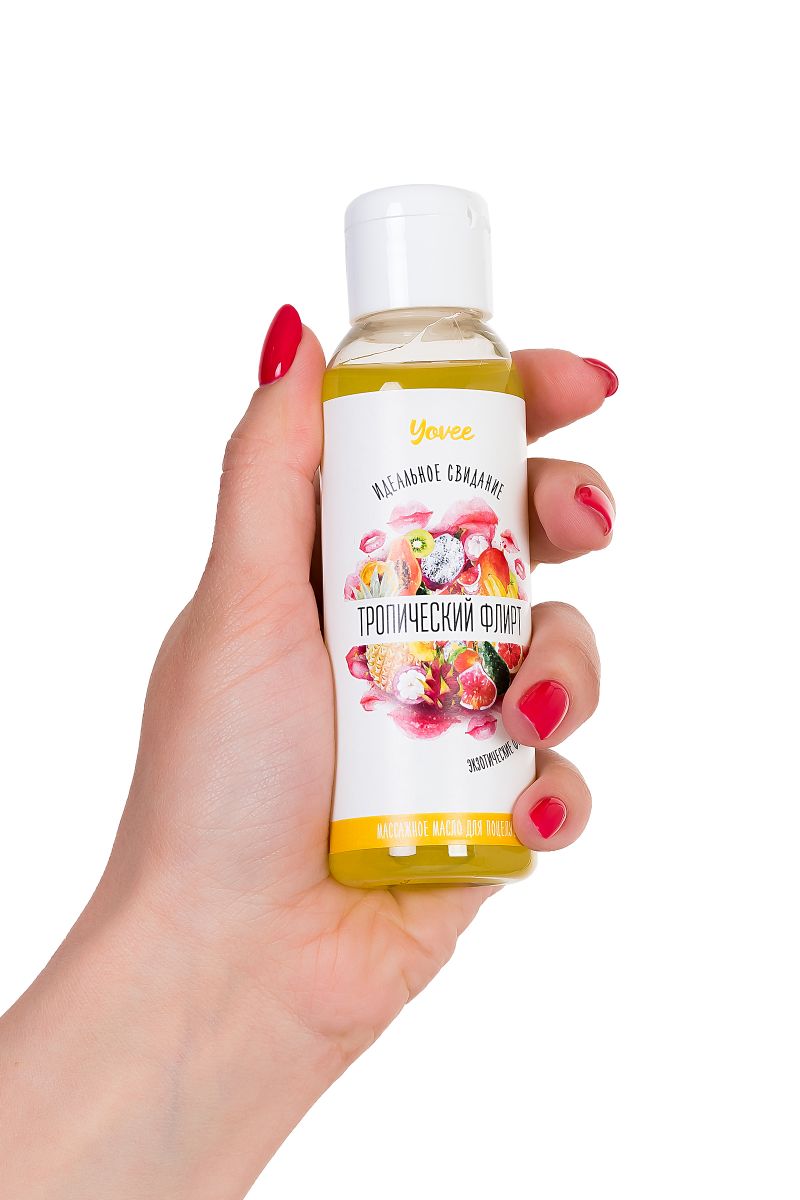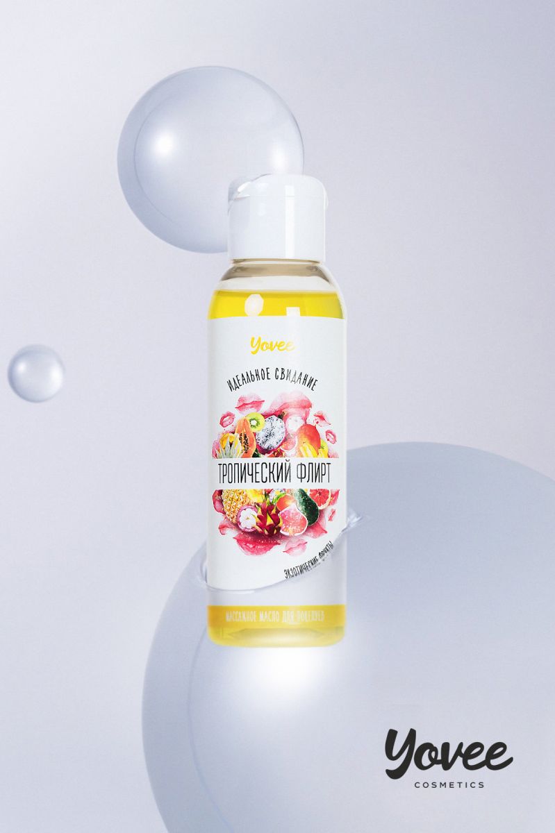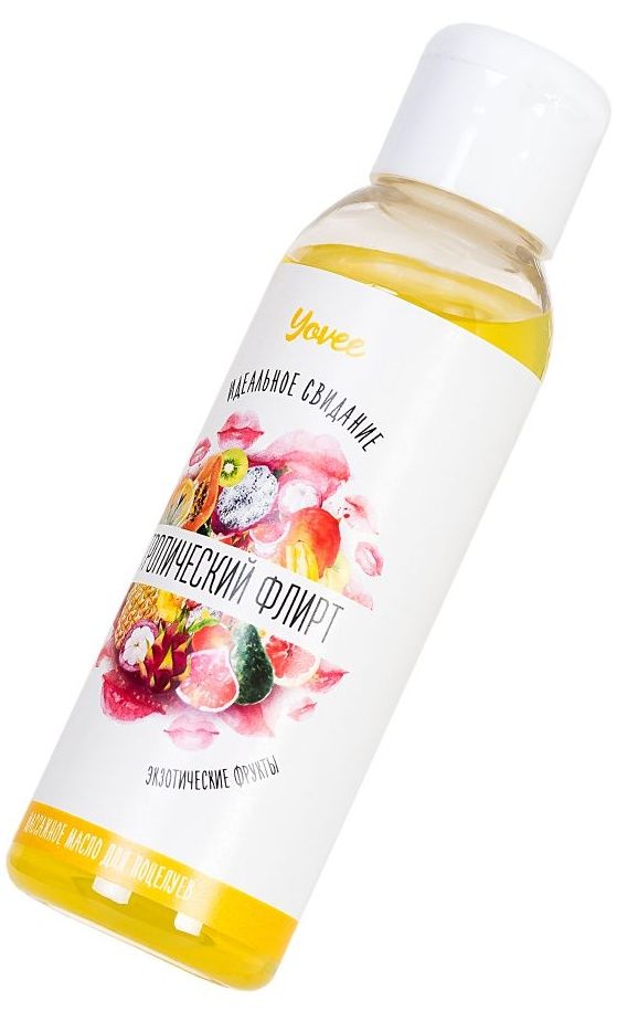 Массажное масло для поцелуев Тропический флирт. Сделайте ваше свидание незабываемым: слизывайте масло прямо со своего партнера! Вам гарантирован настрой на самый экзотический массаж с фруктовым вкусом. Идея для свидания: Предложите партнеру экзотический массаж с поцелуями. Лейте масло вдоль спины медленно, а затем начните слизывать приятное на вкус масло прямо с тела партнера. Такое свидание останется в памяти надолго!