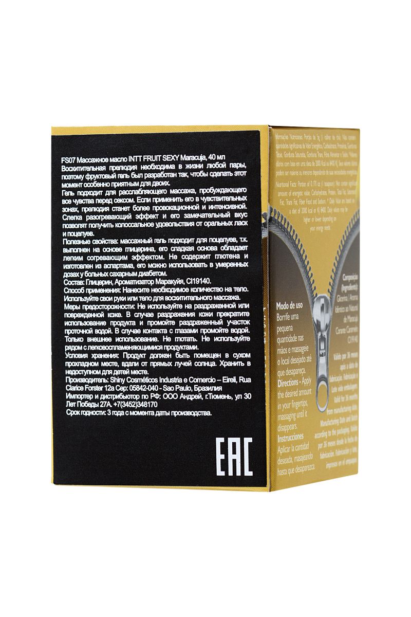 Искра. Буря. Экстаз. Может ли массаж подарить такое? Может, если это массажное масло для поцелуев Intt Fruit Sexy с ароматом маракуйи. Позволяет экспериментировать. Поскольку масло обладает разогревающим эффектом и предназначено для поцелуев, можно не ограничивать себя в сценариях интимных игр. Нанесите Intt Fruit Sexy на тело, поцелуйте несколько чувствительных точек и подуйте на них в течение 3 секунд — возбуждение не заставит себя долго ждать. Провоцирует желание. Экзотический аромат маракуйи создает игривое настроение и помогает расслабиться. Абсолютно безопасная и протестированная формула без сахара и глютена подходит даже аллергикам и диабетикам. Не оставляет ощущения липкости и легко смывается водой.INTT — удовольствие в каждой капле.