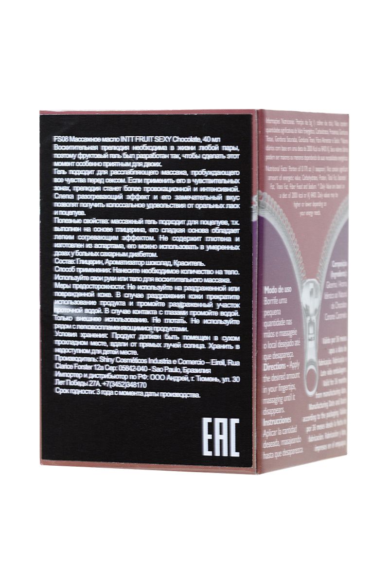 Искра. Буря. Экстаз. Может ли массаж подарить такое? Может, если это массажное масло для поцелуев Intt Fruit Sexy с ароматом молочного шоколада. Позволяет экспериментировать. Поскольку масло обладает разогревающим эффектом и предназначено для поцелуев, можно не ограничивать себя в сценариях интимных игр. Нанесите Intt Fruit Sexy на тело, поцелуйте несколько чувствительных точек и подуйте на них в течение 3 секунд — возбуждение не заставит себя долго ждать. Провоцирует желание. Соблазнительный аромат молочного шоколада создает игривое настроение и помогает расслабиться. Абсолютно безопасная и протестированная формула без сахара и глютена подходит даже аллергикам и диабетикам. Не оставляет ощущения липкости и легко смывается водой. INTT — удовольствие в каждой капле.