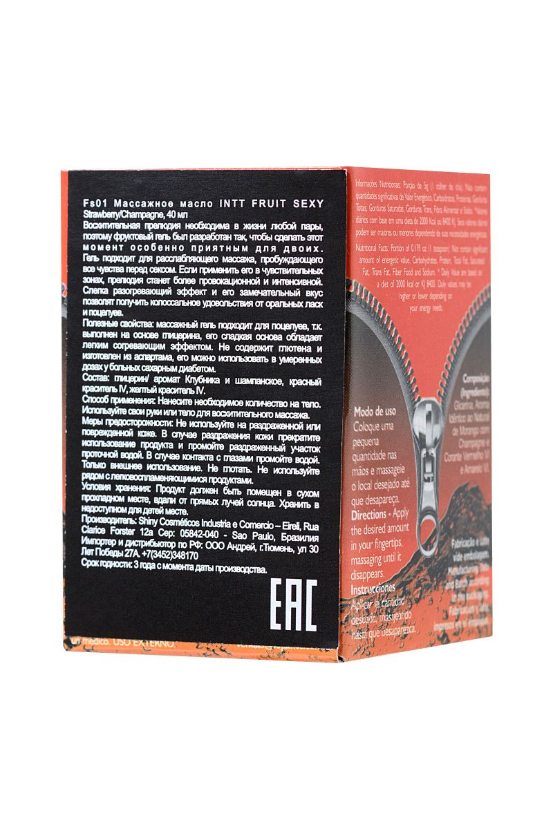 Искра. Буря. Экстаз. Может ли массаж подарить такое? Может, если это массажное масло для поцелуев Intt Fruit Sexy с ароматом клубники и шампанского. Позволяет экспериментировать. Поскольку масло обладает разогревающим эффектом и предназначено для поцелуев, можно не ограничивать себя в сценариях интимных игр. Нанесите Intt Fruit Sexy на тело, поцелуйте несколько чувствительных точек и подуйте на них в течение 3 секунд — возбуждение не заставит себя долго ждать. Провоцирует желание. Соблазнительный аромат сочной клубники и шампанского создает игривое настроение и помогает расслабиться. Абсолютно безопасная и протестированная формула без сахара и глютена подходит даже аллергикам и диабетикам. Не оставляет ощущения липкости и легко смывается водой. INTT — удовольствие в каждой капле.