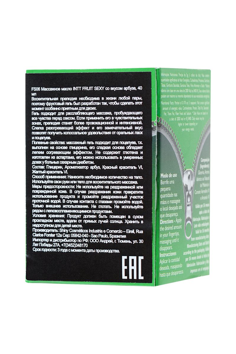 Искра. Буря. Экстаз. Может ли массаж подарить такое? Может, если это массажное масло для поцелуев Intt Fruit Sexy с ароматом арбуза. Позволяет экспериментировать. Поскольку масло обладает разогревающим эффектом и предназначено для поцелуев, можно не ограничивать себя в сценариях интимных игр. Нанесите Intt Fruit Sexy на тело, поцелуйте несколько чувствительных точек и подуйте на них в течение 3 секунд — возбуждение не заставит себя долго ждать. Провоцирует желание. Соблазнительный аромат арбуза создает игривое настроение и помогает расслабиться. Абсолютно безопасная и протестированная формула без сахара и глютена подходит даже аллергикам и диабетикам. Не оставляет ощущения липкости и легко смывается водой. INTT — удовольствие в каждой капле.