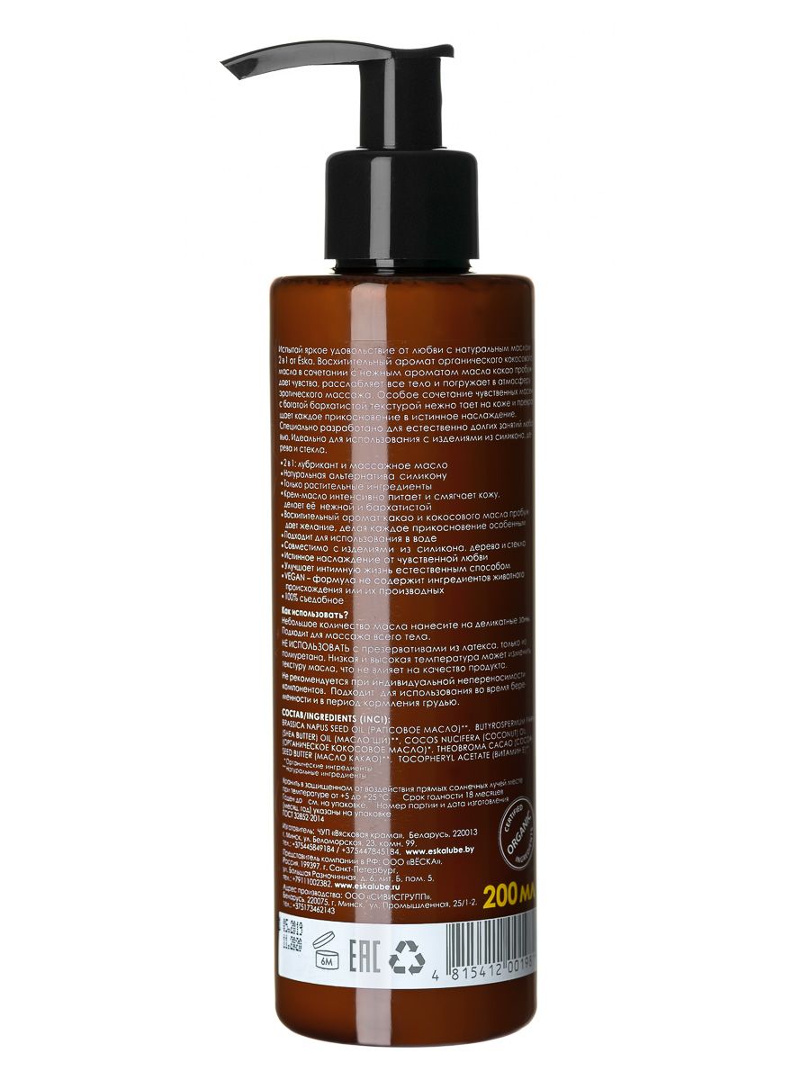 Испытай яркое удовольствие от любви с натуральным маслом 2 в 1 от Ёska. Восхитительный аромат органического кокосового масла в сочетании с нежным ароматом масла какао пробуждает чувства, расслабляет все тело и погружает в атмосферу эротического массажа. Особое сочетание чувственных масел с богатой бархатистой текстурой нежно тает на коже и превращает каждое прикосновение в истинное наслаждение. Специально разработано для естественно долгих занятий любовью. Идеально для использования с изделиями из силикона, дерева и стекла. Подходит для массажа всего тела. НЕ ИСПОЛЬЗОВАТЬ с презервативами и изделиями из латекса. Низкая и высокая температура может изменить текстуру масла, что не влияет на качество продукта. Не рекомендуется при индивидуальной непереносимости компонентов. Подходит для использования во время беременности и в период кормления грудью.