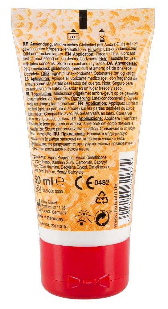 Гель Флутчи Ориджинал на водной основе подходит для анального и вагинального секса, имеет нежный запах амбры (амбра - афродизиак, аромат смолистый, сладкий, терпкий). Облегчает скольжение и надолго оставляет эффект увлажнения. Гель не содержит масло, обезжирен, хорошо смывается водой, не липнет, дерматологически и клинически тестирован, подходит для чувствительной кожи, сохраняет естественную среду организма, не вызывает раздражения. Гель можно использовать с презервативами и секс-игрушками.