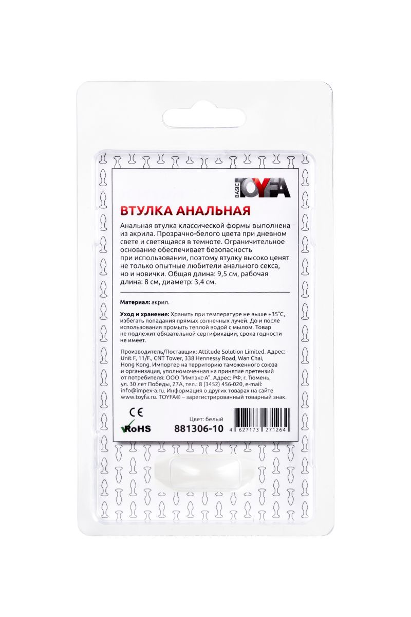 Анальная втулка классической формы выполнена из акрила. Прозрачно-белого цвета при дневном свете и светящаяся в темноте. Ограничительное основание обеспечивает безопасность при использовании, поэтому втулку высоко ценят не только опытные любители анального секса, но и новички. Рабочая длина - 8 см.