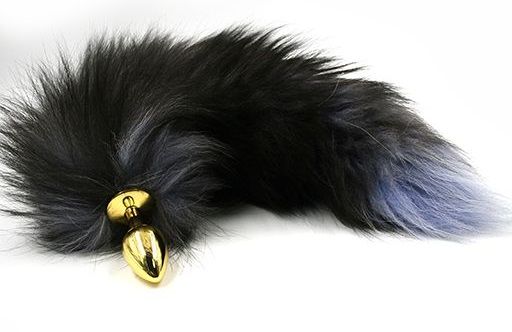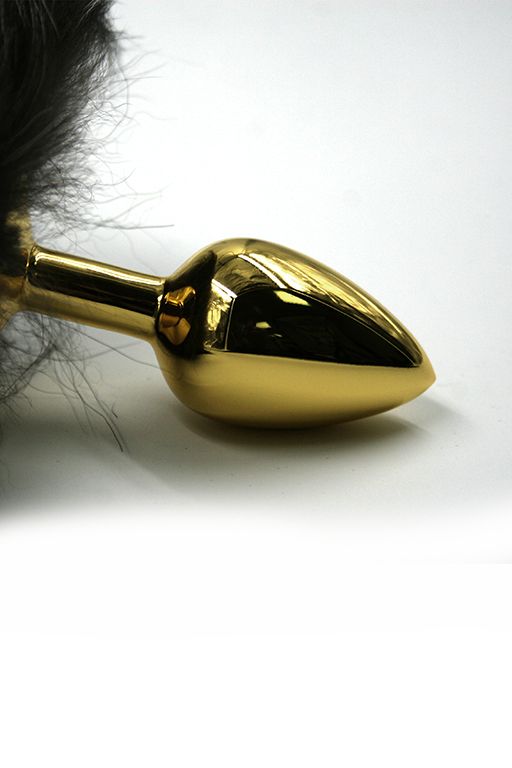 Золотая анальная пробка из алюминия с пушистым хвостом из натурального меха размер S. Упакована для продажи в вельветовый мешочек. Длина пробки - 6,1 см., диаметр - 2,7 см. Вес - 103 гр.