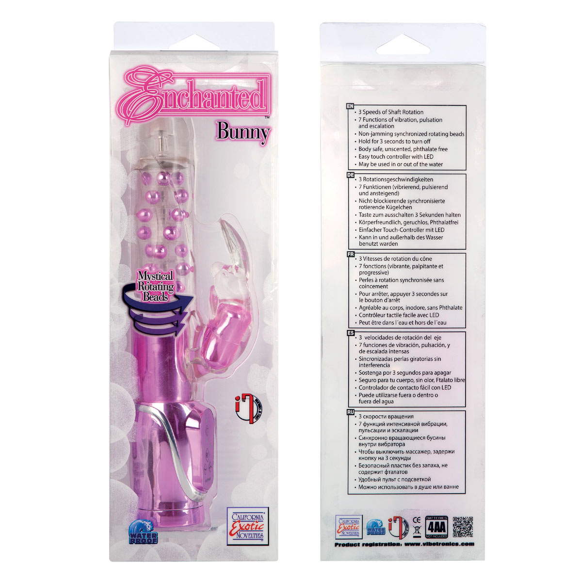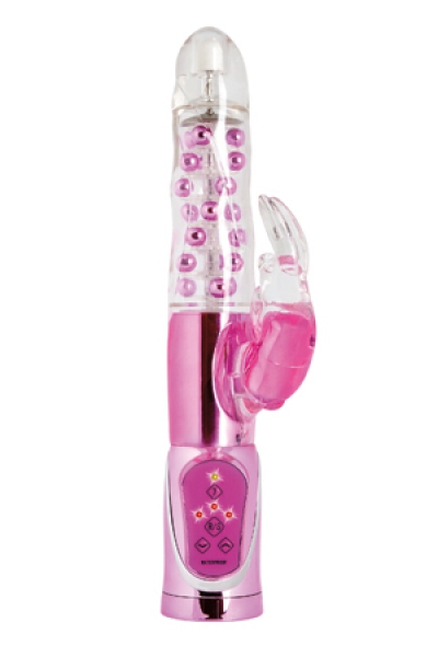Вибромассажер Хай-Тек ENCNANTED BUNNY с классическими для него функциями -семь рядов вращающихся перламутровых шариков с тремя разными скоростями, вибрирующий клиторальный стимулятор - зайчик с семью разными функциями вибрации и пульсации. Вибратор водонепроницаемый, пульт управления вибрациями со светодиодной подсветкой.