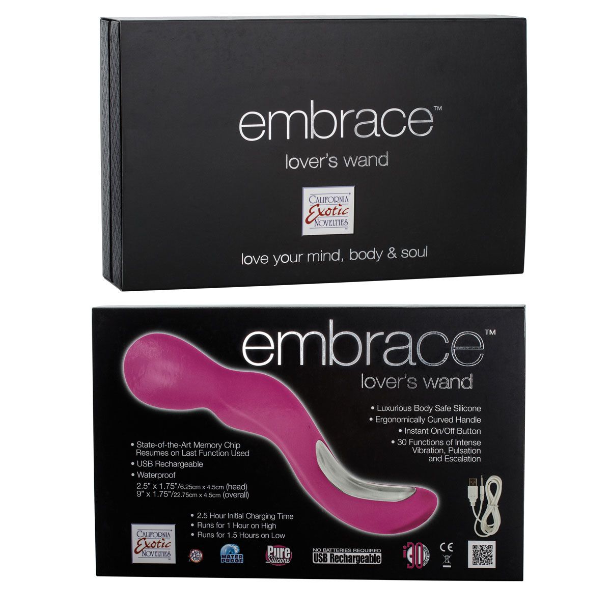 Вибромассажер Embrace Lover s Wand перезаряжаемый - эргономично изогнутый дизайн создан для внешнего массажа и внутренней активной стимуляции. Расслаблению мыслей и возбуждению тела способствуют 30 функций мощной вибрации, пульсации и эскалации. Чип - память возобновляет последнюю функцию наслаждения. Удобное и простое управление. Невероятно интенсивная вибрация по всей площади вибромассажера. Время беспрерывной работы на низкой скорости - 1,5 часа на высокой - 1 час. Зарядка USB в комплекте, полный заряд за 2,5 часа. Длина массажного шарика - 6,25 см: диаметр - 4,5 см.