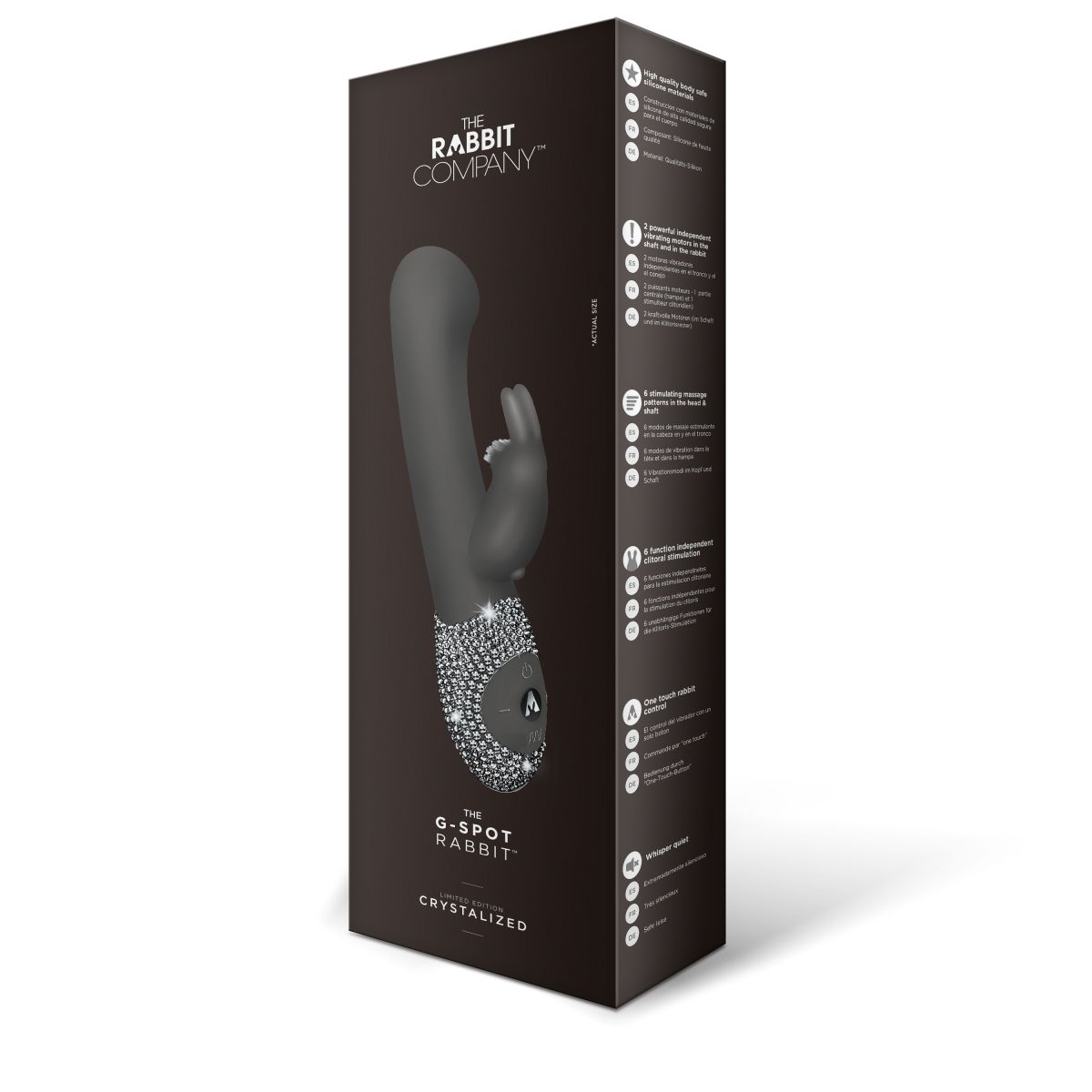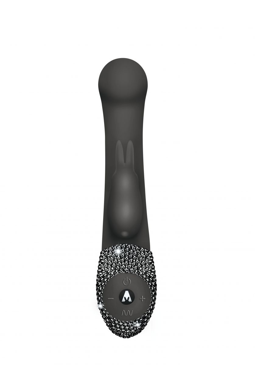 Уникальный по своему исполнению и качеству массажер из гипоаллергенного силикона чёрного цвета. Два мощнейших мотора расположены в стволе массажера и в милом зайчике для клитора. Каждый из моторов имеет 6 режимов - классическая вибрация, волновая вибрация, пульсация, нарастающая вибрация, то нарастающая, то спадающая вибрация, и рандомная. У каждого режима ты можешь менять интенсивность. Ствол массажера имеет специальную форму, которая позволяет точечно воздействовать на точку G. Данная модель черного цвета из ограниченной коллекции CRYSTALIZED - пульт управления вручную украшен супер переливающимися кристаллами. Кроликом легко управлять - чтобы включить кролика используй отдельную кнопку включения, тогда одновременно заработают и вагинальная часть и клиторальный зайчик. Рабочая длина - 11 см. Время зарядки - 2,5 часа. Время работы - 2 часа. В комплекте запасной набор кристаллов.