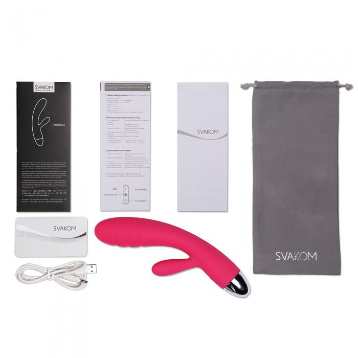 Изящно изогнутый корпус вибромассажера Barbara от Svakom выполнен из нежнейшего силикона высшего качества, ствол вибратора обладает крупной головкой и несколькими ребристыми впадинками на ней, которые будут восхитительно массажировать точку G. Аккуратный отросточек в это время одарит нежными ласками клитор и половые губки благодаря отдельному вибромоторчику внутри. Многоуровневая рокочущая, но практически неслышная вибрация исходит от двух независимых виброэлементов, которые активируются удобным кнопочным пультом управления, расположенным на рукоятке изделия.