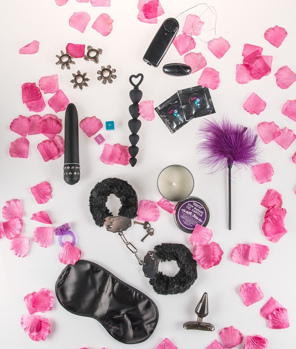 Набор для сексуальных игр, наполненный разнообразными штучками марки ToyJoy. Идеальный выбор для тех, кто еще не определился, что именно ему хочется попробовать. Или для тех, кто хочет все и сразу!) В комплекте виброяйцо, милые пушистые наручники, перышко, вибратор со стразами, эрекционное виброкольцо на пенис, комплект силиконовых колец на пенис, массажная свеча, маска на глаза, анальная пробка, анальная цепочка, кости для игр вдвоем, смазка на водной основе и лепестки розы. Что еще нужно для идеального вечера? Для работы вибромассажёров требуются 2 батарейки типа АА и 2 типа ААА (нет в комплекте). В комплекте: виброяйцо, наручники, перышко, вибратор, эрекционное виброкольцо, 4 эрекционных кольца без вибрации, массажная свеча, маска на глаза, анальная пробка, анальная цепочка, кости для игр вдвоем, смазка на водной основе (2 саше) и лепестки розы.